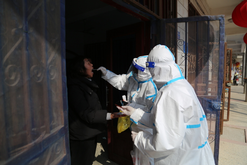 35日,連云港市海州區通報發生新冠肺炎疫情,形勢十分嚴峻。崗埠上下迅速行動起來,按照要求組織開展全員核酸檢測。全員核酸檢測要求一天內對崗埠所有在家人員進行檢測,農場四個點位同時開始,負責檢測的人員特別緊張。馬素蓮得知這一情況,主動和相關人員溝通,暫停了自家門診,帶領醫生錢冬梅、護士錢明霞加入了振興廣場籃球場監測點的核酸檢測人員隊伍。從35日到11日,她們三人一直堅守在核酸檢測一線,每天檢測人員合計達到兩三千人。有時候,她們需要配合網格員深入鎮區、生產區各居委會上門為行動不便的人員進行采樣,足跡遍布大街小巷,密不透風的防護服常常讓她們滿臉通紅透不過氣來。護士錢明霞告訴筆者,311日當天,她負責部分小區的核酸采樣工作,光是6樓就爬了6次,腿最后跟灌了鉛一樣,挪不動?!坝袝r候晚上嘴里吃著東西就睡著了。”