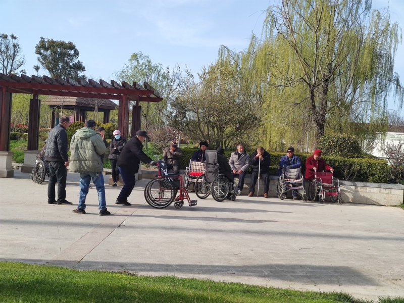 我們發現,來這里休憩的老人中,推著輪椅來的老人特別的多,這些老人中,有自己轉著輪椅過來的,也有兒女推著他們過來的。“我爸總是讓我將他推到公園中來,他就喜歡與同齡人在一起熱鬧熱鬧,這樣他的心情才舒暢。”胡鐵成的兒子將老人推到公園坐椅著時對我“老人怎么說怎么好,我們做兒女的,滿足下他們的心愿就好了。圖為老人們在一起交談時的鏡頭。