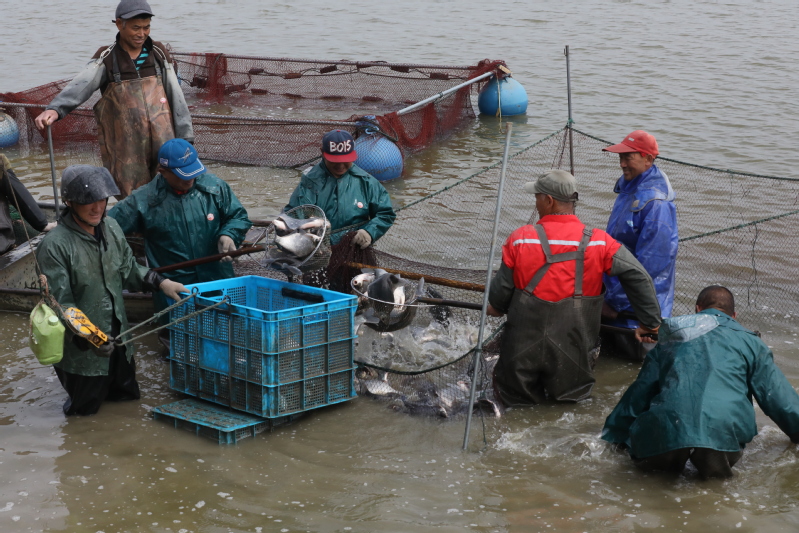 513日,寶應湖農場劉圩養殖場養殖戶楊金林正在起捕塘口鳊魚。
