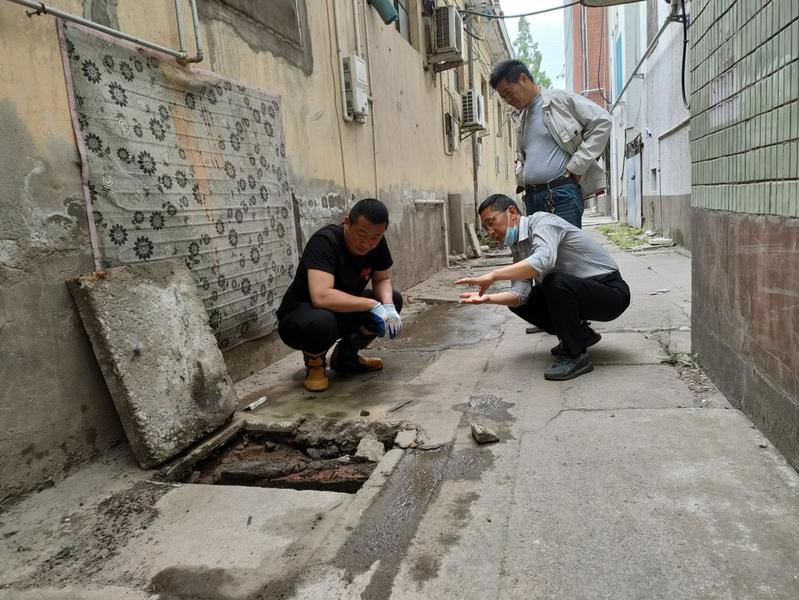 5月19日下午,新洋社區(qū)城西居委會黨支部書記蔡文良帶領(lǐng)黨員王強及居民組長一行在一號樓前面清理下水道。早在兩個多月前,一號樓就出現(xiàn)了下水管堵塞的現(xiàn)象,由于無人維修,堵塞問題日益嚴(yán)重,管道污水逐漸上漲,漫延到地面,妨礙了樓內(nèi)居民的進出。