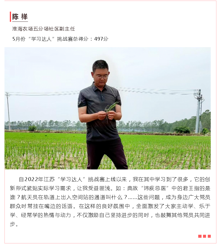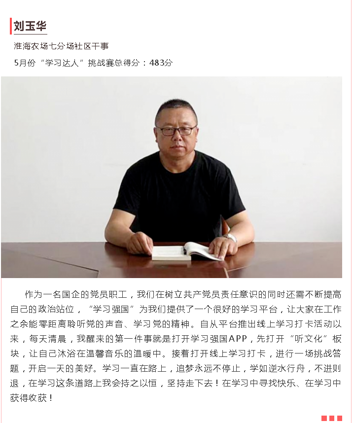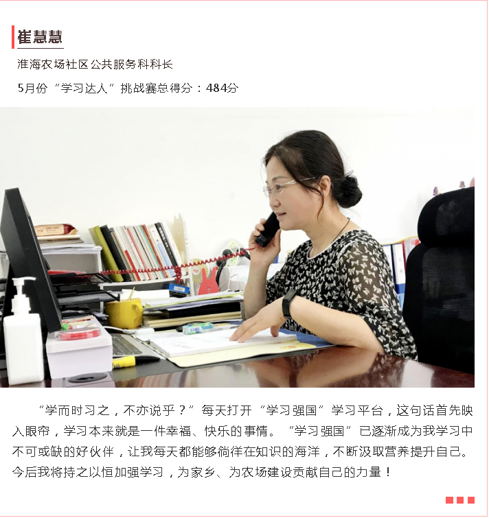 為充分展示學習達人風采,根據射陽強國復興有我群眾性主題宣傳教育活動安排,射陽宣傳推出訪學習達人看家鄉變化主題尋訪萬里行活動第一期,全縣5月份最厲害的11學習達人”中,淮海“學習達人”馮輝、陳祥、崔慧慧、劉玉華躋身其中,讓我們一起來聽聽淮海的“學習達人”們在工作中、生活上的心得感悟吧!圖為淮海學員“學習達人”們的心聲感悟。