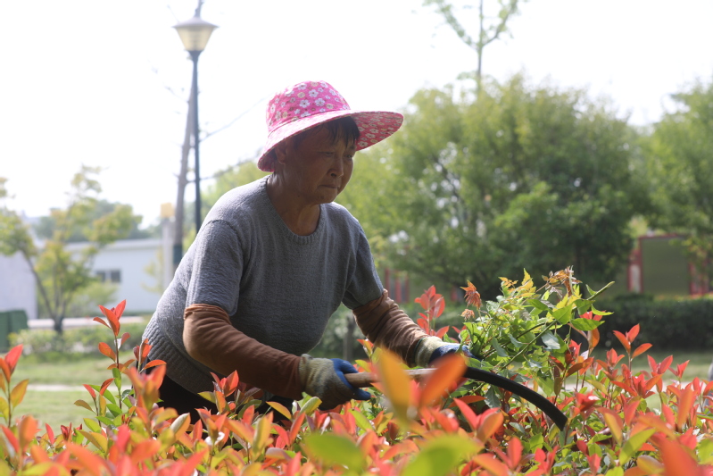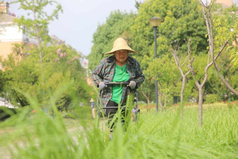 727日,寶應湖農場職工文化公園,7名工人正在為公園綠化除草。越是高溫雜草長得越旺。以席正英為隊長的綠化員們分工合作。草坪上用電動切草機清理,隨著“隆隆”的機聲,切碎的草屑在刀頭間飛濺,濺到了工人的身上、飛上了工人的臉龐,刺癢刺癢,淡淡的青草味洋溢在夏日的晨光里。綠化帶里,爬騰類的雜草枝枝蔓蔓,覆蓋的綠化樹上,工人們就用手先拉斷經脈,再扯掉枝葉;低矮類的雜草擁擠在綠化樹間,工人們蹲下身子就用手拔、用刀割。當天7名工人清理綠化300多平方米。