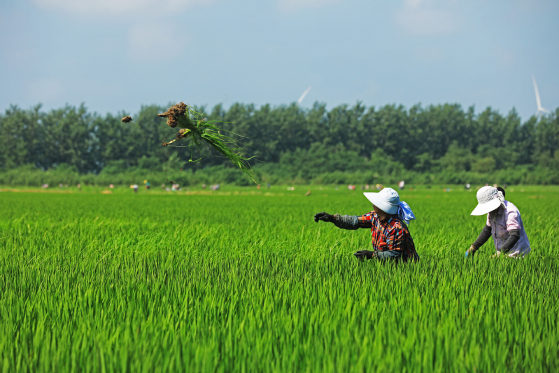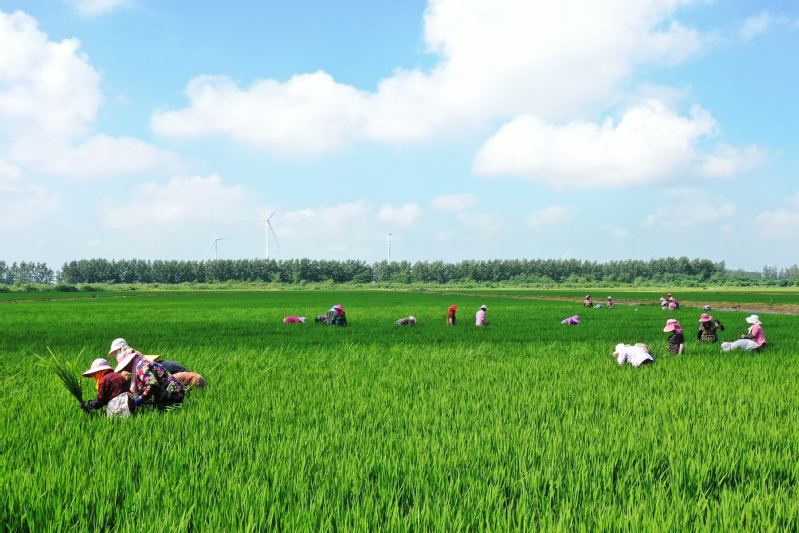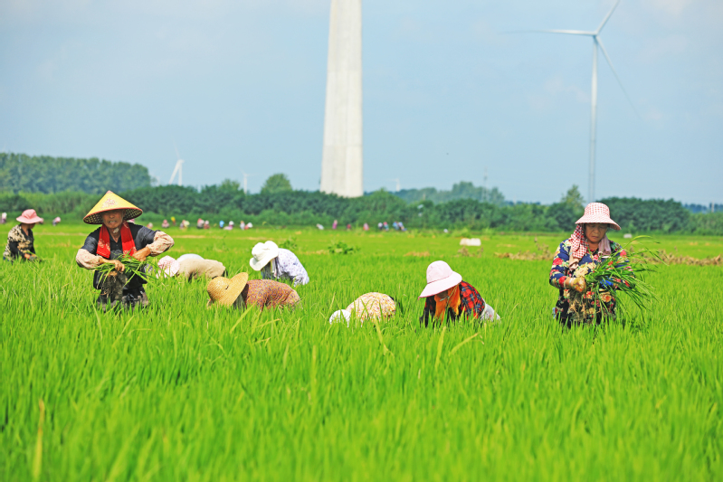 蘇墾農發寶應湖分公司擁有3500畝有機稻生產基地,該基地于2021年取得歐盟、國環雙認證。為保障有機稻質量,每到夏季,公司都會組織進行人工拔“雜草稻”。高溫炙烤下,200多名勞動者揮汗如雨,為生產出“魚米之鄉”高質量有機米貢獻力量。