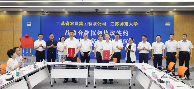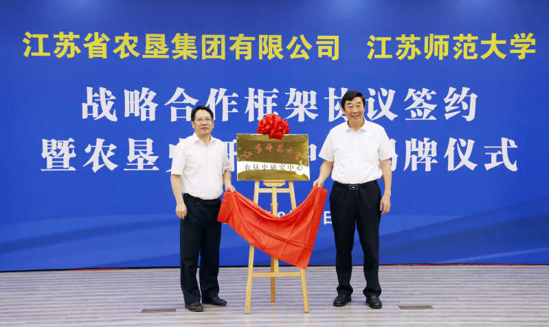 8月10日上午,集團公司與江蘇師范大學戰略合作框架協議簽約暨農墾史研究中心揭牌儀式在徐州舉行。集團公司黨委書記、董事長魏紅軍,江蘇師范大學黨委書記方忠出席并致辭。集團公司黨委副書記、總經理胡兆輝與江蘇師范大學黨委副書記、校長周汝光共同為江蘇師范大學農墾史研究中心揭牌。集團公司黨委副書記姚準明與江蘇師范大學黨委常委、副校長蔡國春共同簽署《戰略合作框架協議》。江蘇師范大學農墾史研究中心主任岑紅發言。集團公司黨委委員、總會計師劉克英,黨委委員、紀委書記李旭東,副總經理劉耀武,黨委委員、副總經理王立新,黨委委員、工會主席楊義林,江蘇師范大學黨委常委、黨委宣傳部部長孟召學,黨委常委、黨委統戰部部長、黨委辦公室主任商亮出席。