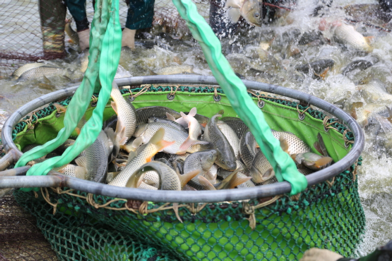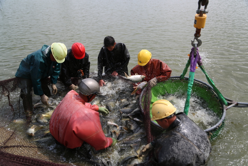 初秋的早晨已然涼意十足,早上不到6點,天剛蒙蒙亮,捕撈人員就來到魚塘開網起魚。在水產公司工作人員的指揮下,一張巨大的漁網隨著捕魚工人的移動緩緩張開,大家不顧冰冷的水下溫度,緊張忙碌了起來。經過鋪底、收網、聚攏等環節的共同協作,漁網被慢慢升起……整個現場一片繁忙熱鬧景象。經過近三個小時的忙碌,在大家的精心分揀下,裝滿魚的筐子被吊車有序吊起,稱重、記錄、放魚一氣呵成。“這個吊車頂部的黃色圓塊就是電子秤,吊起魚的同時,秤上的信號就發到這個無線接收裝置上來,秤重既方便又精準?!爆F場記賬的方正解釋說。