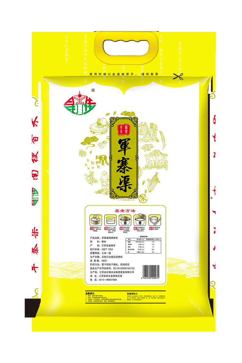 “軍寨渠”商標于2018年注冊,商品使用類別為第30、31類。圖案里的水果造型寓意“農(nóng)副產(chǎn)品”;“綠色”寓意與健康同伴相融,生生不息;“軍寨渠”是黃海農(nóng)場母親河,一直哺育著農(nóng)場遼闊的土地。上世紀60年代末開挖軍寨渠時,農(nóng)場職工和知青幾乎都參與到工程建設(shè)中,留下了關(guān)于軍寨渠建設(shè)的深刻記憶。以此為商標,也是紀念黃海這段“墾荒史”,傳承墾荒文化。