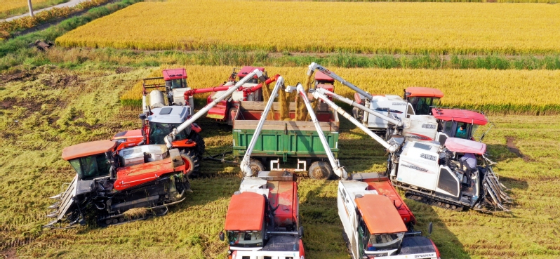 10月25日,蘇墾農發江心沙分公司搶抓晴好天氣,組織收割機集中開展大規模水稻收割作業,切實將“豐收在望”轉化為“豐收到手”,彰顯農業“國家隊”擔當。收割現場,收割機、運糧車來來往往,一片繁忙景象。