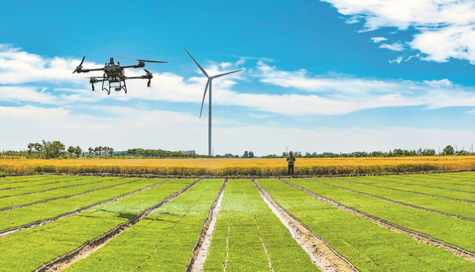 昨日,位于射陽縣的江蘇農墾新洋農場搶抓農時,組織植保無人機對水稻秧苗進行飛防作業,通過精準施藥和施肥,提高育秧質量,為水稻豐產增收夯實基礎。 張偉生 攝 (視覺江蘇網供圖)
