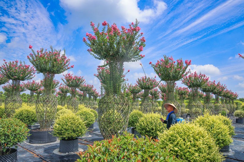8月14日,在江蘇省鹽城市射陽縣,江蘇農墾新洋農場容器苗項目基地,管理人員正在養(yǎng)護紫薇花瓶。近年來,新洋農場利用容器苗基地優(yōu)勢,在栽培方式上大膽嘗試,通過扦插培育,實現(xiàn)了自繁自育栽培技術的新突破,容器栽培的模式使苗圃成活率更高、綠化效果更好,優(yōu)良的品質廣受全國各地綠化項目方的青睞。