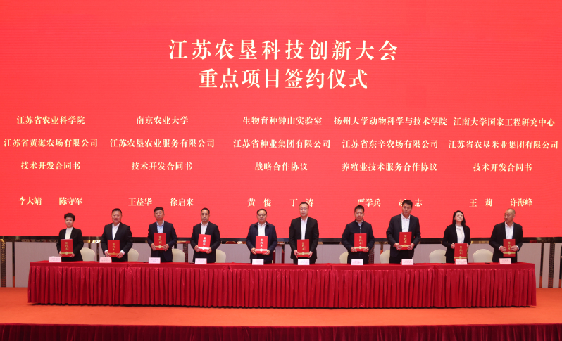 會(huì)上,吳本輝、姜建友共同為江蘇農(nóng)墾漁業(yè)科技有限公司和江蘇省農(nóng)墾產(chǎn)業(yè)技術(shù)研究院有限責(zé)任公司揭牌,吳本輝為蘇墾漁業(yè)研發(fā)中心、蘇墾米業(yè)研發(fā)中心、蘇墾麥芽科技創(chuàng)新中心、金太陽(yáng)糧油研發(fā)中心、勤奮藥業(yè)研發(fā)中心、金象傳動(dòng)研發(fā)中心授牌,姜建友發(fā)布江蘇農(nóng)墾2024-2025年揭榜掛帥項(xiàng)目榜單,生物育種鐘山實(shí)驗(yàn)室、省農(nóng)科院、南京農(nóng)業(yè)大學(xué)、江南大學(xué)、揚(yáng)州大學(xué)分別與集團(tuán)公司所屬企業(yè)簽署重點(diǎn)項(xiàng)目合作協(xié)議。