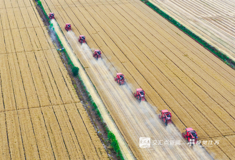 (特約攝影 許昌銀 錢厚紅 15:24攝 20:39上線)五月的麥田,金穗飄香。5月26日,淮安盱眙洪澤湖畔的江蘇農墾三河農場的3.82萬畝小麥開鐮收割。當地利用晴好天氣加緊收割,確保顆粒歸倉。
