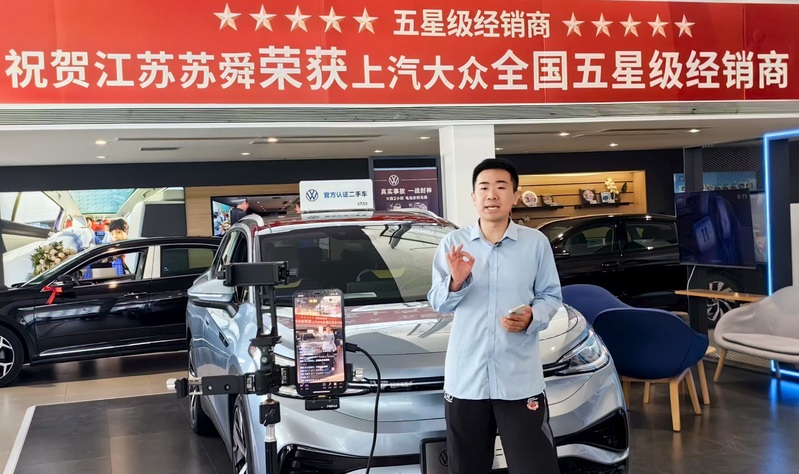 蘇舜公司創新“直播+服務”銷售模式,重點發力“抖音、小紅書”等平臺,加大直播場次與粉絲互動,將留資轉化率提升至12%,平均觀看時長達到23分鐘。圖為工作人員在直播間提供二手車在線置換評估、金融方案計算等服務。