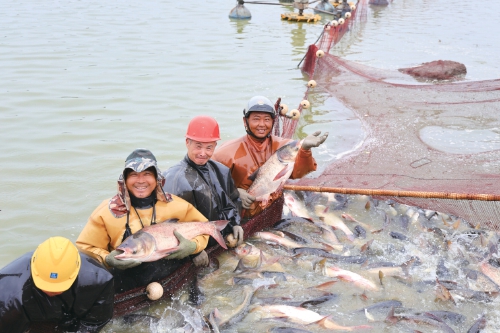 近日,江蘇省連云港市海州區的江蘇農墾崗埠農場,工人們在魚塘里拉網捕撈分揀花鰱、白鰱等水產品,準備發往周邊市場銷售。
