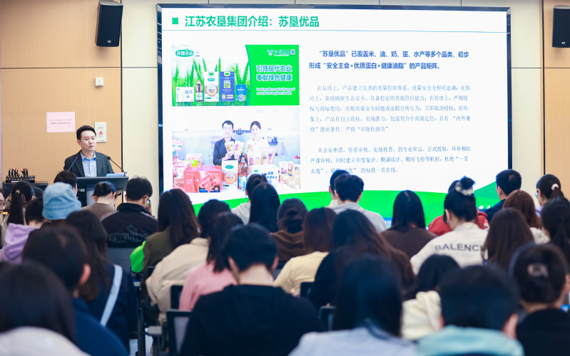 宣講會現場,工作人員還特意帶來多款江蘇農墾的產品與同學們分享。蘇墾乳業的簡蘇A2β原生高鈣純牛奶、蘇墾米業的蘇米滋鍋巴,以及新曹農場即將上市的玉谷香鹵蛋,都收獲一致好評。這些實實在在的產品,讓同學們直觀感受到江蘇農墾對質量與安全的追求。