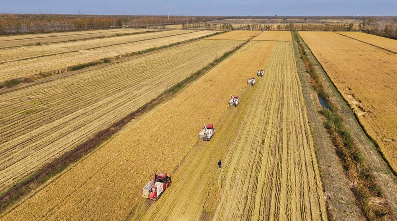 11月5日,連云港市海州區(qū),江蘇農(nóng)墾崗埠農(nóng)場(chǎng)的高標(biāo)準(zhǔn)農(nóng)田里,職工駕駛收割機(jī)來(lái)回穿梭,開(kāi)展水稻搶收工作。連日來(lái),當(dāng)?shù)胤e極組織人員、機(jī)械,搶抓農(nóng)時(shí)做好水稻收割工作,爭(zhēng)取盡快完成秋收,確保顆粒歸倉(cāng)。徐衛(wèi) 方冉冉 攝