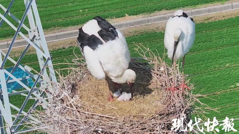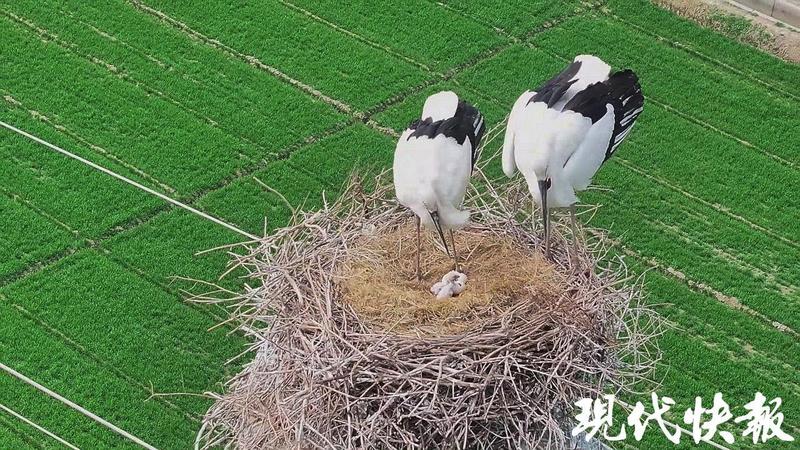 3月19日中午,江蘇農墾臨海農場員工宋婧通過一個多月的耐心蹲守和精心拍攝,成功用無人機航拍技術,全程記錄下國家一級保護野生動物東方白鸛從產蛋、孵化到三只“寶寶”孵化出殼的全過程。