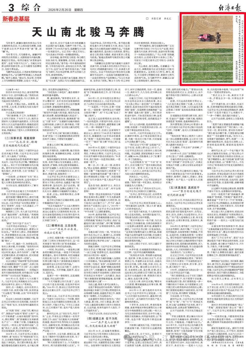 連日來,中央電視臺、《經濟日報》《光明日報》等多家中央主流媒體將目光投向江蘇農墾新洋農場春耕春管一線,集中報道農場依托現代科技賦能農業生產的生動實踐,展現新質生產力在田間地頭煥發出的蓬勃活力。3月2日,央視一套《新聞聯播》聚焦新洋冬小麥春管現場春管正當時,科技顯擔當。在今年的春耕春管作業中,農業無人機已然成為田間管理的“主力軍”。在蘇墾農發新洋分公司的小麥田里,一架搭載多光譜相機的農用無人機短短5分鐘就采集到了180畝小麥的基礎信息。“就好像給麥苗‘做CT’一樣,自動生成出‘處方圖’,變量施肥。”農機社會化應急保障中心副隊長孫晨形象地解釋道。這項智能技術的應用,讓每一塊農田都能享受到“定制營養餐”,不僅大幅提升肥料利用效率,更推動田間管理從“粗放式”向“精細化”加速轉型。此前,央視相關欄目在2月28日同一天紛紛關注這則新聞。2月26日,《經濟日報》綜合版2月25日,江蘇省鹽城市射陽縣新洋農場的一處高標準農田里,搭載著北斗導航系統的激光平地機在進行春耕作業,為水稻育秧做好準備。 張偉生攝2月27日,《光明日報》教科新聞版科技助春耕。2月25日,江蘇省鹽城市射陽縣新洋農場的一處高標準農田里