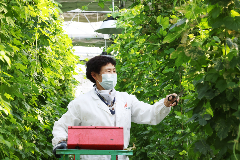 2月17日,云臺農場興墾科技員工在整理啤酒花藤蔓(上圖)。2月17日,云臺農場興墾科技工作人員在整理蝴蝶蘭育苗(下圖)。