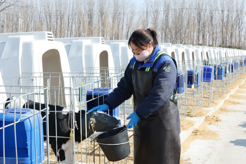 2月18日,蘇墾乳業工人在優然牧業犢牛島添水加料、喂食牛犢。