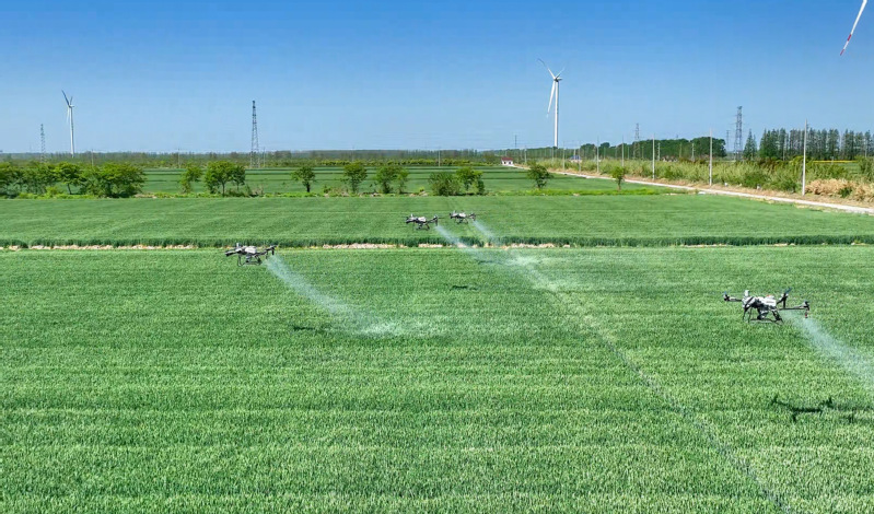 在蘇墾農(nóng)發(fā)新洋分公司新北生產(chǎn)區(qū)高標準農(nóng)田,五臺滿載生物藥劑的北斗導航植保無人機正沿著預設(shè)航線精準噴灑葉面肥,多光譜測繪無人機同步監(jiān)測苗情長勢,全力守護麥田健康。新洋分公司將綠色防控與統(tǒng)防統(tǒng)治有機結(jié)合,所有基層一線青年員工全部掌握無人機操作技術(shù),實現(xiàn)了近6萬畝農(nóng)田的飛防作業(yè)全覆蓋。目前,共引入更新大疆T70、T100等新型無人機23臺。