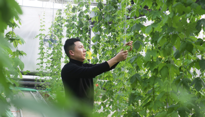 云臺農(nóng)場利用資源優(yōu)勢,積極與龍頭企業(yè)、科研機(jī)構(gòu)對接,開發(fā)特色種植。目前,與蘇墾麥芽訂單種植的大棚啤酒花長勢喜人。圖為技術(shù)人員正在為新長出的啤酒花側(cè)枝繞蔓。