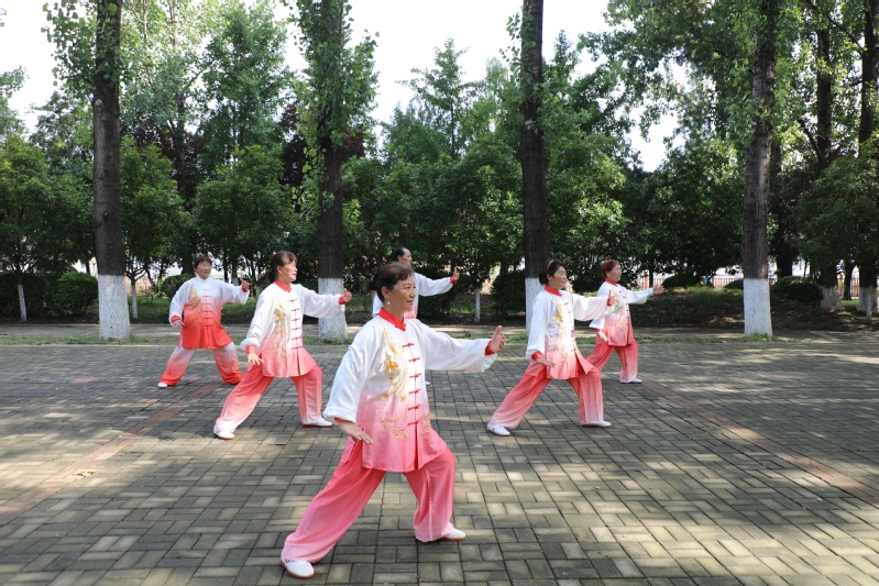 每日清晨,走進東辛公園,景色優美、河水蕩漾、綠樹成蔭、百鳥爭鳴,荷塘內夏日荷花婀娜多姿、競相綻放,藍天白云和隨風搖曳的柳枝倒映在水面上,宛若一幅動態的風景畫,給東辛公園增添了幾分獨有的美麗。穿過蜿蜒曲折的步道,在東辛公園西北角,這里參天大樹四面環繞,空氣清新沁人心脾,是居民群眾免費的室外“健身房”。只見6名太極愛好者身著粉色太極拳服,音箱內播放著舒緩的音樂,他們動作整齊劃一,身形靈活揮灑自如,將太極拳含蓄內斂、連綿不斷、急緩相間、行云流水的風格展現得淋漓盡致,吸引了許多公園晨練者駐足觀看。其中一位愛好者楊老師說:“平日里大家工作都特別忙,現在盛夏時節天亮的早,公園內風景優美,我們太極拳愛好者每天6點半左右就開始集合鍛煉,堅持打太極對男女老少身體都特別有益,尤其對肩頸舒緩非常有幫助,越來越多的人加入到太極拳隊伍中來。”在練習隊伍中,出現了不少年輕人的身影,充分展示了農場居民健康積極、樂觀向上的精神風貌。傍晚時分,結束了一天忙碌的工作和學習,東辛文化廣場燈光籃球場上人頭攢動,這里有暑期放假的學生,也有居民籃球愛好者,還有單位職工相約三五好友一道來到這里揮灑汗水,切磋球技。傳球、控球、擋拆、