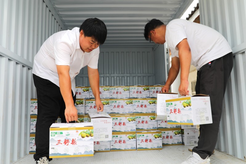 自7月18日三河生態梨園開園以來,線上線下客戶訂單絡繹不絕,日訂單量達千余盒,圖為林業中心工作人員搬運“三舒”梨裝車發貨。