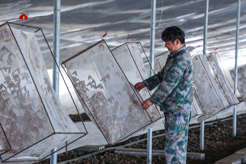早春豆丹量少價高,許多豆丹養(yǎng)殖戶求購春季豆丹卵。在蘇墾農(nóng)發(fā)云臺分公司豆丹繁育基地,該基地充分發(fā)揮技術(shù)、設(shè)備優(yōu)勢,做好豆丹卵生產(chǎn)供應(yīng)銷售工作。圖為工作人員楊越查看豆天蛾成蟲情況。