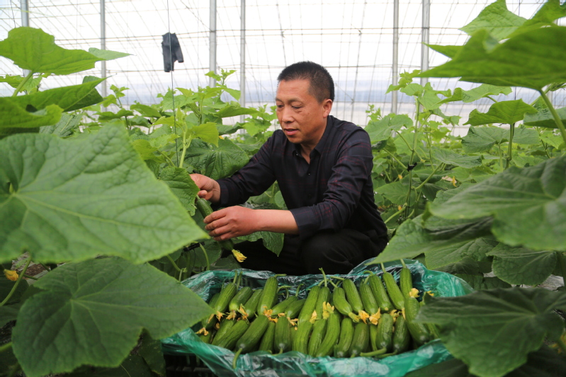 4月16日,連云港市海州區(qū)崗埠農(nóng)場,工人們正在大棚里采收新鮮的水果黃瓜,準備供應(yīng)市場。近日,當?shù)卮笈锼S瓜陸續(xù)成熟上市,采取了線上直播銷售、供應(yīng)超市、進棚采摘等多種銷售渠道并行的方式,滿足市場需求。