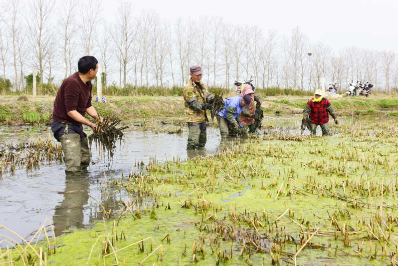 為充分發(fā)揮區(qū)域龍頭企業(yè)的作用,大力扶持和發(fā)展綠色低碳創(chuàng)新型企業(yè),近年來,淮海農(nóng)場有限公司通過各項惠農(nóng)政策,將過去私營小作坊的愛蓮苑水生花卉有限公司,打造成全國知名的科創(chuàng)型愛蓮苑水生花卉品牌。愛蓮苑水生花卉基地中有完整的雜交圃、選育圃和株行圃,共培育出近百個荷花新品種,有10個品種在全國荷花新品種評比展示中獲得一二三等獎。圖為3月31日,愛蓮苑正按照百萬株水蔥的市場訂單需求,在組織員工涉水采摘。