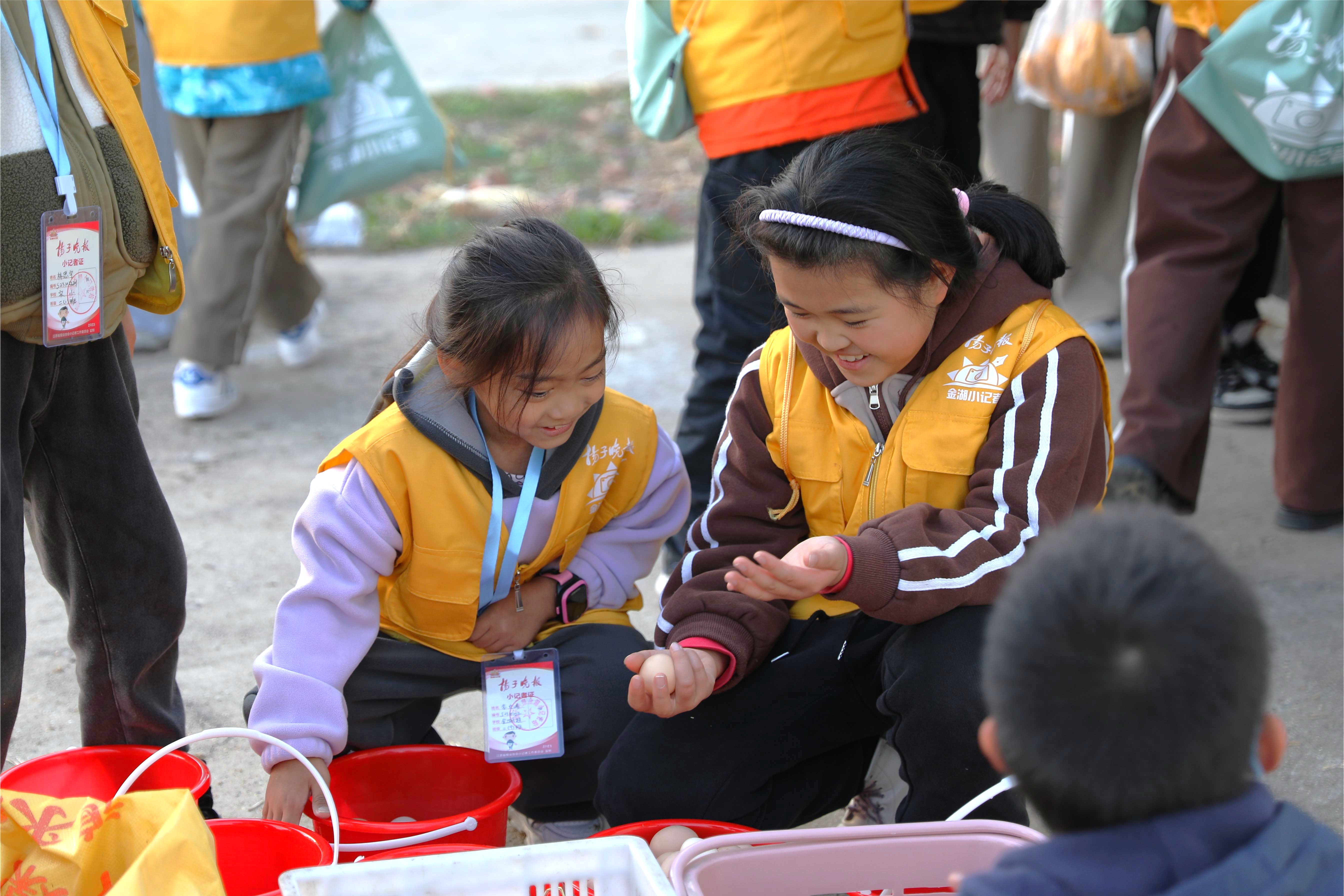 近日,寶應湖農場“揚子晚報小記者現代化農業基地”在大會堂揭牌。隨后60余名小記者先后前往寶應湖農科所、農場公司新時代文明實踐所、農場公司杜仲林生態農莊參觀體驗。圖為2名揚子晚報小記者歡快地將撿拾的雞蛋小心翼翼地放入籃子中。