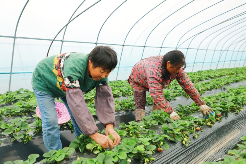 11月10日,江心沙農場生態果園內,草莓喜掛果、青紅相間,職工趕在寒潮和大風天氣來臨前做好雜草拔除、枯葉清理等管理工作,以及大棚維護和密封處理,為草莓提供良好的生長環境,嚴防草害凍害等發生。