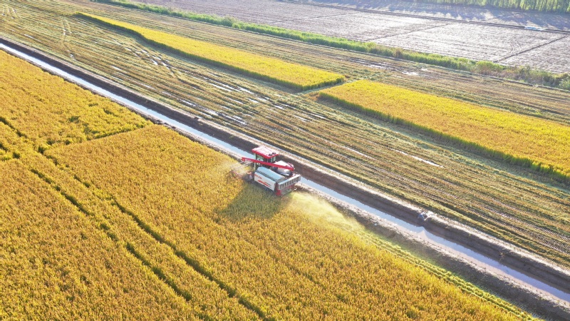 2023年10月28日,在蘇墾農發新洋分公司新南生產區19大隊的高標準農田上,五臺凱斯7088大型聯合收割機穿梭在稻田中搶收水稻。蘇墾農發新洋分公司搶抓晴好天氣,發揮農墾企業機械化優勢,確保秋糧顆粒歸倉。