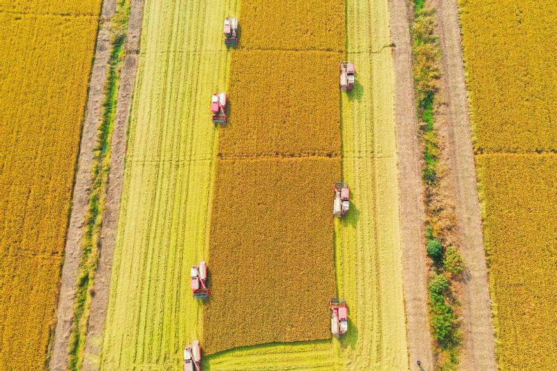 眼下,崗埠水稻收割進入尾聲,伴隨著機械的轟鳴聲,一臺臺水稻收割機在稻田間來回穿梭作業,職工們搶抓農時,搶收勞動成果,確保顆粒歸倉。圖為2023年10月30日,農發崗埠分公司積極組織收割機械、運糧機械200多臺搶收水稻,確保5萬畝水稻顆粒歸倉。