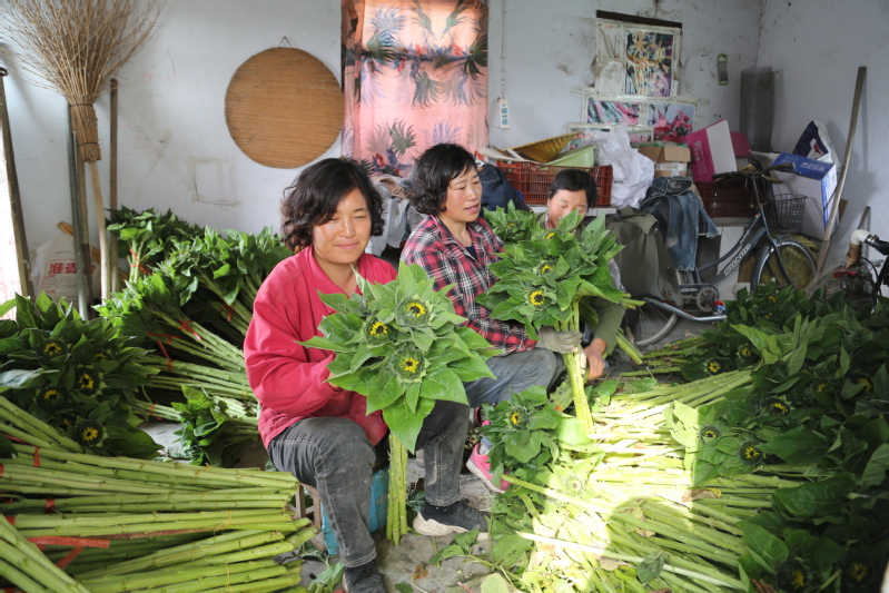近年來,崗埠農場公司注重高效設施農業的綠色生態轉型發展,引導種植戶調優農產品結構,在減輕農藥化肥使用量、提升種植效益上下功夫,取得了顯著成效。種植戶們引進了許多好管理、施肥施藥少、效益好的鮮切花品種,如百合花、向日葵、郁金香等作物,大大降低了對土壤的污染,又增加了種植戶們的收入。圖為種植戶們正在包裝剛采收的向日葵鮮切花,準備發往上海等地銷售。