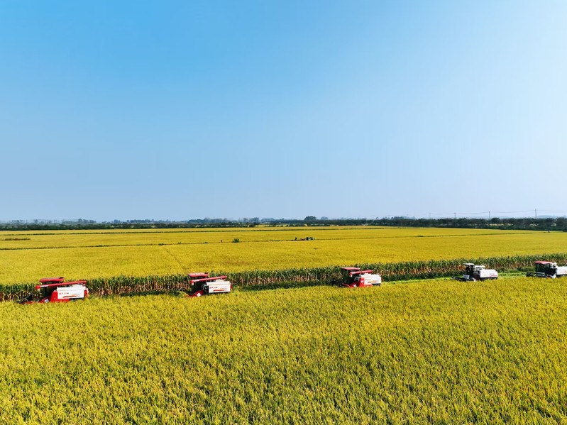“開鐮了!豐收了!”10月17日上午10時,一臺臺聯合收割機駛向蘇墾農發新洋分公司新北生產區5大隊,金黃的水稻被大型機械收入“囊”中,新洋5.3萬畝水稻機收作業正式拉開序幕。今年“三秋”是集團公司第二次黨代會勝利召開后的第一個農忙,做好“三秋”工作意義重大,黨委班子成員靠前指揮,深入田間查看水稻收割情況。稻田接連成片,稻穗迎風擺動,收割機馬力全開、縱橫馳騁,收割、脫粒、裝車……一氣呵成,一派豐收的喜人景象。收割現場,蘇墾農發新洋分公司嚴格收割質量監督,把機械減損作為糧食增產的重點,加大收割質量檢查力度,減少收割損失,實現秋糧顆粒歸倉?!拔覀兠芮嘘P注天氣情況和水稻成熟度,統籌安排,堅持質量第一,進度第二,努力做到成熟一塊收割一塊,穩步推進收割進度。”農業中心負責人介紹。蘇墾農發新洋分公司立足“前期‘揀’收、中期‘穩’收、后期‘搶’收”的原則,充分利用秋收早期溫度高,有利晾曬、烘干的條件,適時收、曬、烘,為秋播及時騰茬,確保11月6日前完成秋播田塊收割任務。面對不穩定天氣因素,蘇墾農發新洋分公司強化機械保障,本部準備收割機58臺套,運糧車53臺,另調度好26臺小型履帶式收割機,隨時應對突發