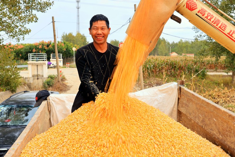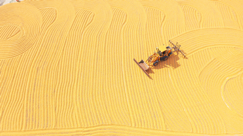 10月12日,云臺農場的一處糧食場面,工人們搶抓晴好天氣,駕駛糧食翻曬機械在場面內來回穿梭,翻曬收獲的玉米。