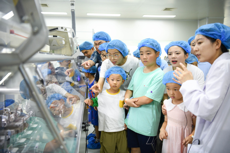 云港連夏荷,晴天正秋風(fēng)。8月20日,正大天晴第二季“愛(ài)在天晴 家倍美好”家庭活動(dòng)日在連云港廠區(qū)舉辦。開(kāi)幕式上,人力資源中心總監(jiān)代表公司向在企業(yè)發(fā)展中辛勤付出的天晴人及其背后的家人表示感謝,同時(shí)宣布自2024年起,正大天晴將增設(shè)“高考陪考假”,切實(shí)將公司的“六為文化”及“家文化”傳遞給每一位勤奮拼搏的天晴人。儀式上,公司代表為即將開(kāi)啟大學(xué)生活的“晴二代”們送上升學(xué)祝賀、頒發(fā)獎(jiǎng)學(xué)金。伴隨著熱烈的掌聲和飛向天際的氣球,第二季家庭日活動(dòng)在歡聲笑語(yǔ)中正式開(kāi)啟。在研究院,小朋友們?cè)谘邪l(fā)人員的指導(dǎo)下,小心翼翼地將白色乳糖粉末填充到膠囊殼中。往常見(jiàn)到都要躲著走的膠囊,這一刻卻成了愛(ài)不釋手的小寶貝。在精心準(zhǔn)備的化學(xué)小試驗(yàn)中,生活中常見(jiàn)的醋、雪碧,都有自己專(zhuān)屬的“酸堿色”。玻璃瓶中的五顏六色激起了孩子們的好奇心和求知欲,也在他們心中播下了一顆探索的種子。在生產(chǎn)車(chē)間,小朋友們隔著護(hù)欄近距離地觀看正在作業(yè)的機(jī)械臂,伸展、抓取、轉(zhuǎn)身、放置……機(jī)械手臂行云流水般的動(dòng)作讓他們發(fā)出陣陣驚嘆。在大型生產(chǎn)設(shè)備前,孩子們?nèi)褙炞⒌芈?tīng)著講解。現(xiàn)代化藥物生產(chǎn)車(chē)間在小朋友眼里像極了鎧甲勇士的基地,置身其中,像是一腳踏進(jìn)了特?cái)z片的
