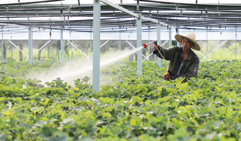 7月9日,三河農(nóng)場(chǎng)農(nóng)業(yè)科技示范園工作人員對(duì)草莓苗開展降溫除濕、打藥、打老葉等工作。