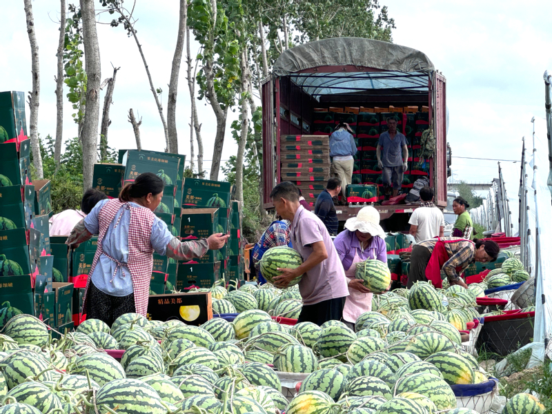 7月8日清晨6點(diǎn),東壩頭農(nóng)場(chǎng)的西瓜大棚已是一片繁忙。翠綠的瓜葉間,一個(gè)個(gè)飽滿圓潤(rùn)的西瓜點(diǎn)綴其間,空氣中彌漫著清甜的果香。目前,每天有近20噸西瓜從這里出發(fā),通過物流專線發(fā)往廣州、上海、杭州等城市的生鮮市場(chǎng)和大型商超。