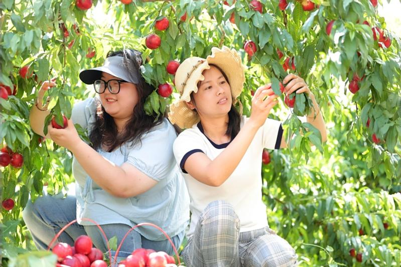 近日,云臺(tái)農(nóng)場(chǎng)云水灣濕地公園近30畝桃樹進(jìn)入成熟采摘期,色澤誘人、果香四溢,吸引眾多游客前來采摘、觀賞和客戶訂購(gòu)。圖為游客置身云水灣桃園內(nèi)采摘成熟的油桃,在濕地景觀環(huán)繞中體驗(yàn)采摘樂趣。